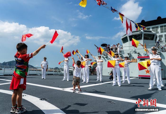 10月1日,停泊于中国人民解放军驻香港部队昂船洲军营的海军戚继光舰(舷号83)和沂蒙山舰(舷号988)举行舰艇开放活动,接受市民登舰参观,军民共庆新中国成立76周年。图为小朋友跟随戚继光舰的海军学员学习旗语。 中新社记者 侯宇 摄
