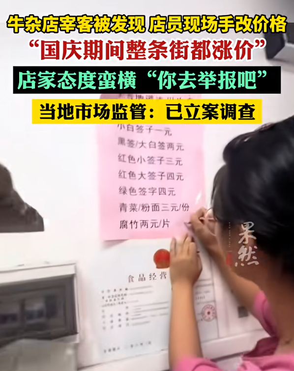 经核查,该牛杂店经营场所内有公示商品销售价目表,但未提前告知消费者国庆节期间价格上涨的情况。10月4日,该消费者到店消费时,该牛杂店经营者按其公示价目表每串加收一元的标准进行结算,结算金额为203元,该行为违反了《中华人民共和国价格法》有关条款规定。目前我局已责令其退回该消费者多付的价款50元,并处以罚款3500元的行政处罚。
