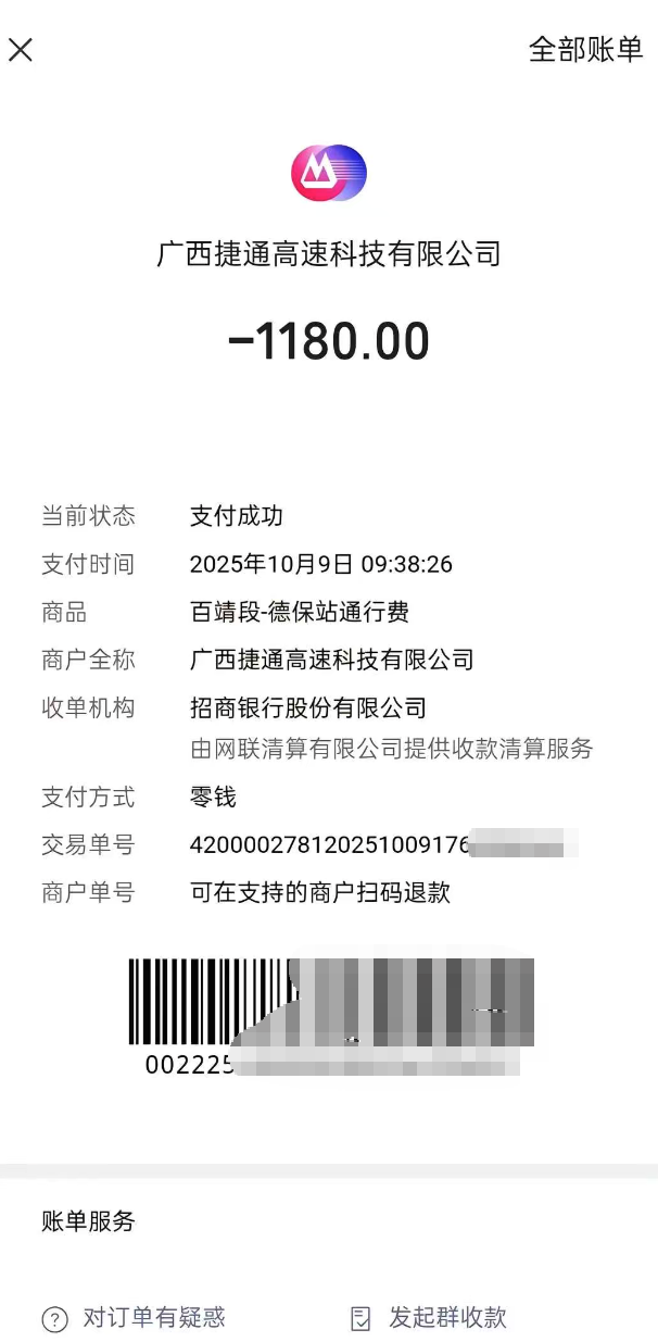 10月9日,广西百色。知名公益人士胡雷发文质疑广西高速称,他向百色市德保县慈善促进会捐赠一批抗洪救灾应急物资,也向当地报备过,但却被收1180元高速费。