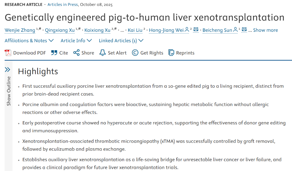 该文报告了全球首例活人体内猪肝移植术,由安徽医科大学第一附属医院、云南农业大学等联合团队完成。