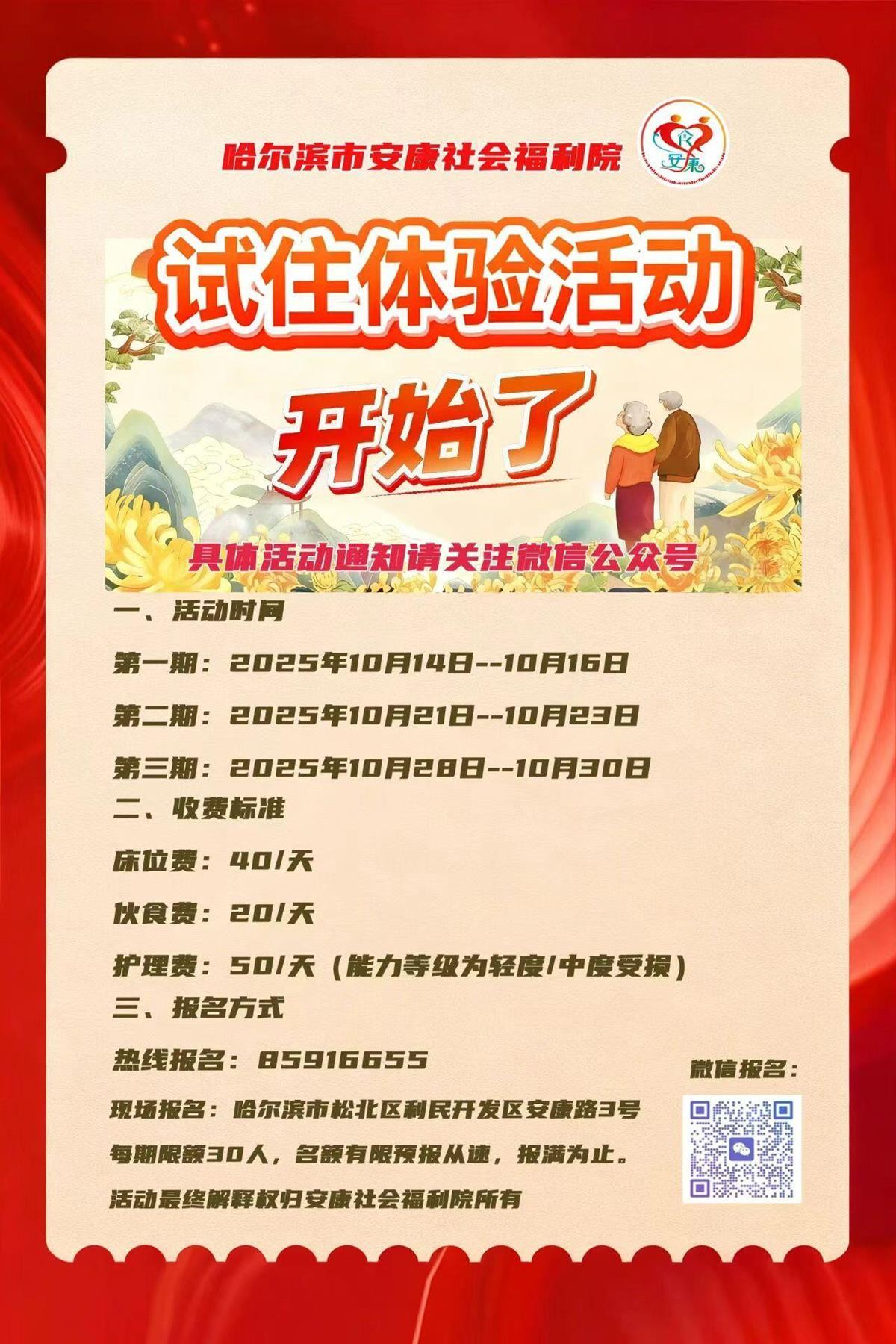 12日上午,极目新闻记者以报名者身份咨询情况,该院工作人员介绍,目前没多少人报名,第一批还有名额,1200元管住宿,吃饭是另算600元/月,参观体验入住是政府搞的开放月活动,院方只是参加,试住最多3天,每天40元床位费,20元的餐费,试住主要是针对老人和家属。工作人员还表示,该院是养老机构,常住男性60岁、女性55岁以上。