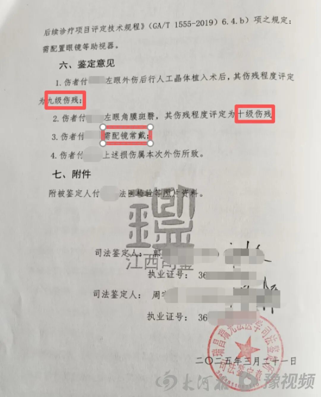 魏女士称,经过两次手术,经历了约4个月的治疗后,于2025年3月5日回家进行康复训练。目前伤残等级被评定为9级与10级共存,孩子左眼植入人工晶体,看近处必须佩戴特殊眼镜,否则看不见近处事物。
