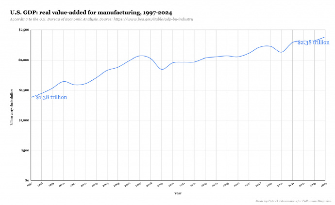 例如Patrick Fitzsimmons在《PALLADIUM》10月3日发表的文章《GDP如何掩盖工业衰退》,就是一个较为深刻的反思。作者开头就提出一个疑问:美国GDP一直升,但做的东西越来越少,认识的大多数聪明人都在做“假工作”。上世纪90年代美国有香港或者越南制造的玩具衣服,但洗衣机、汽车、电脑等高科技商品是美国制造的。然而,现在几乎没啥东西是美国造的了。