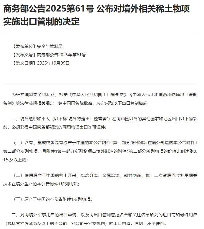 10月9日,商务部公告首次在稀土领域引入“0.1%价值占比”门槛,对标了美国出口管制中的“长臂管辖”。