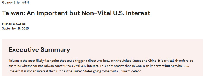 美国昆西研究所的高级研究员史文(Michael D. Swaine)从军事与战略角度,进行了反思,认为台湾对美国没那么重要,放弃战略模糊,不要承诺战争。史文9月25日发了两份系列报告,《台湾是重要但非至关重要的利益》、《超越战略模糊:在不承诺战争的情况下支持台湾》。