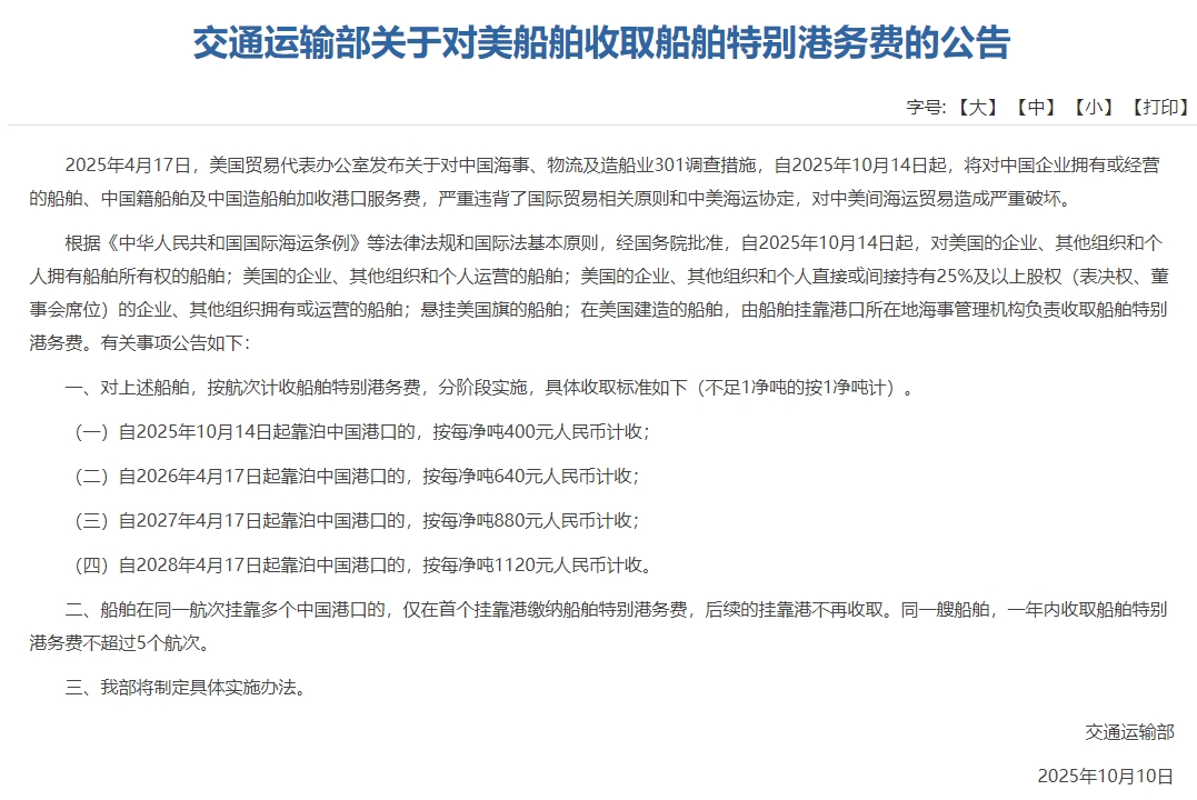 10月10月,中国交通运输部公布对美反制措施。可以看出,2025年10月14日开始征收港务费,2026、2027、2028年逐渐增加费用——都与美国政策对等。由于中美在海运与造船业的地位极不对称,如按身份对等反制,则只有美森轮船会受影响。
