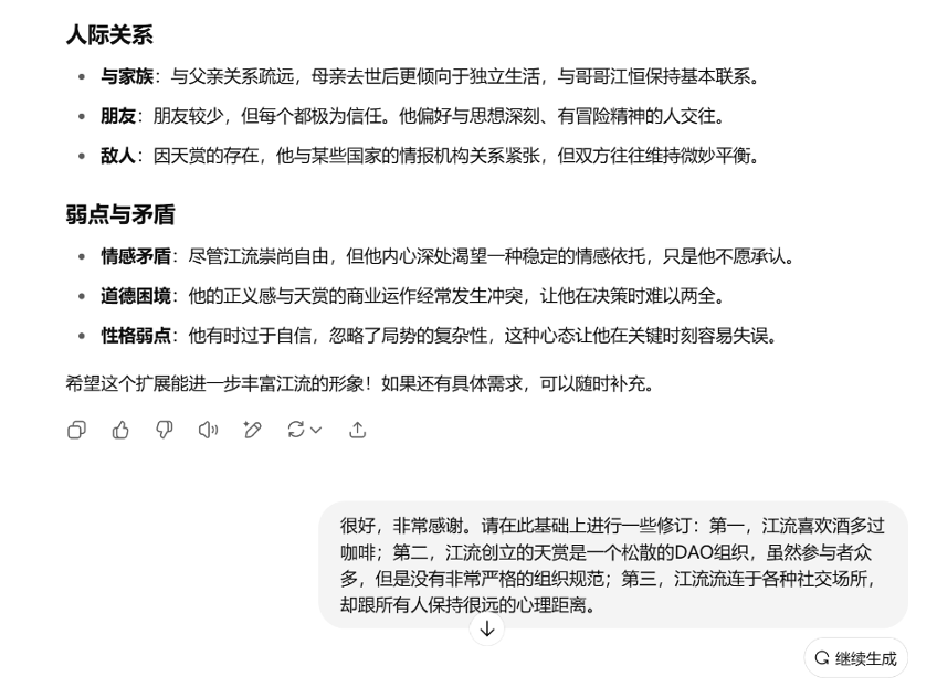 我今年新完成的一部长篇科幻小说《折叠宇宙:吞噬文明》,里面有一个人物叫江流,他是小说中一个重要角色。我会把我对这个人物的一些基础设想告诉人工智能,让它帮我完成人物的详细设定。