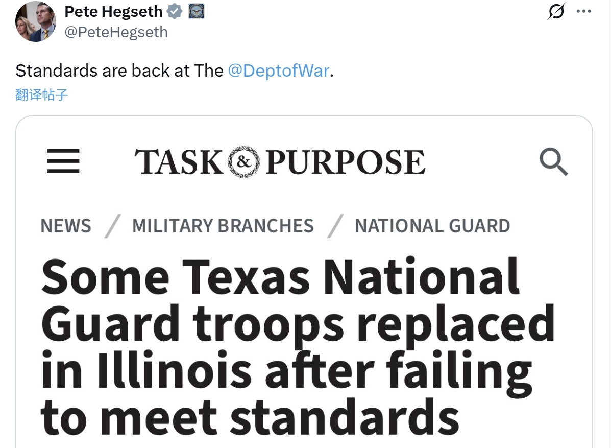 此后,得克萨斯州军事部门的发言人也向美国军事新闻网站“任务与目的”(Task amp; Purpose)透露,在部署至伊利诺伊州的200名国民警卫队士兵中,“一小部分人”因未达到特定标准已被替换。但该部门拒绝透露涉及的具体部队、人数和原因。