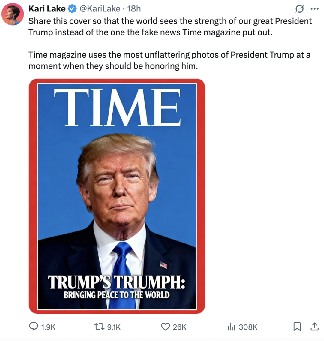 在X上,特朗普的支持者卡里·莱克(Kari Lake)——现任美国全球媒体署代理首席执行官——发布了一张伪造的“修正版”封面