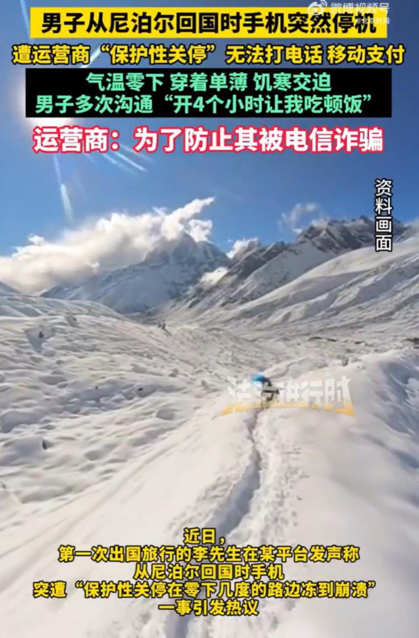 李先生称,他询问中国移动客服后得知,为了防止其被电信诈骗,手机号被进行了“保护性关停”。聂拉木县气候严寒,下着大雪,李先生穿着单薄,饥寒交迫,却无法拨打电话和移动支付,他对移动客服讲述了自己的困境,希望能把数据连接打开4个小时,让他去吃顿饭,叫个车,但对方就是处理不了。