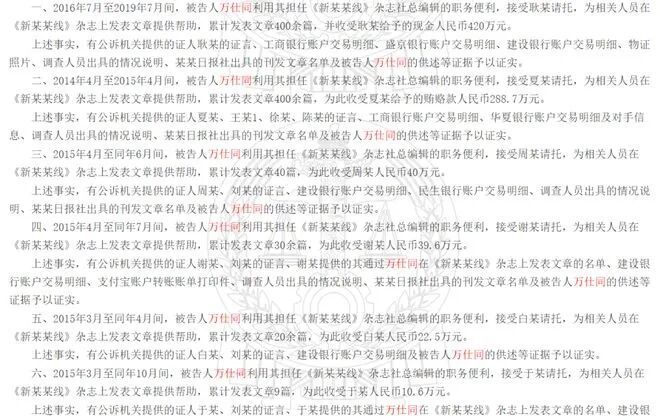 案例显示,2014年4月至2019年7月,万某同任某杂志社(事业单位)总编辑,分管编辑出版与经营工作。其间,他利用职务便利,多次为他人在刊发文章、经营合作等事项上提供帮助,收受贿赂共计人民币824.4万元。