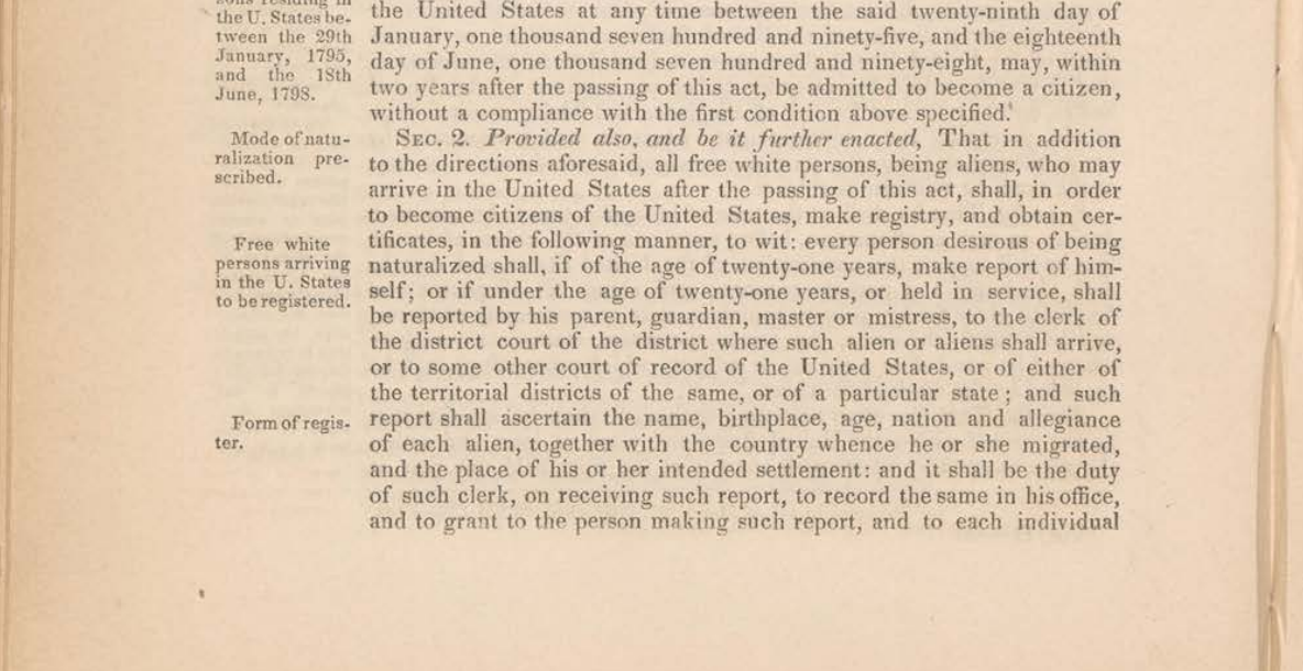 1802年美国联邦立法规定,到达美国的外国人(当时限于“自由白人”)如有意在将来正式入籍,需去法院花50美分“注册”自己的个人信息,包括姓名、出生地、年龄、民族、原效忠对象和国籍等,并自己买下抄本保存,将来申请入籍时作为抵达美国时间的证明——当时白人男性入籍只有“在美五年”一个条件。至于女性,是丈夫的附属品,随夫自动入籍;不过当时美国女性反正没有政治权利,入不入的也没什么用。