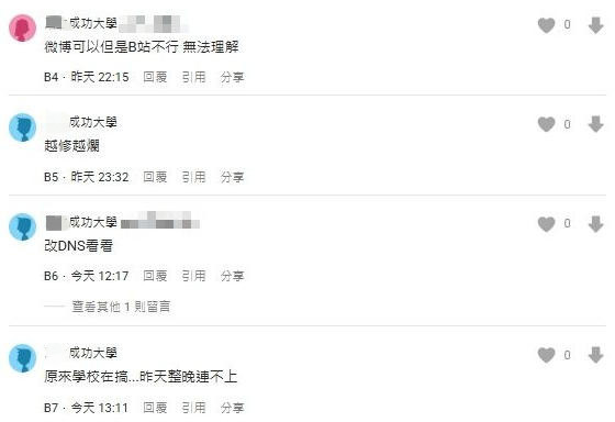 报道称,这场“B站遭封锁”风波,波及台湾成功大学、台湾政治大学、台湾中山大学等高校。