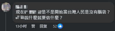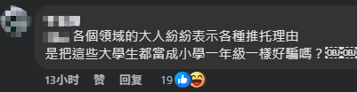 他们写道,“现在台当局是不是开始当台湾人民没有脑袋?说什么就会信什么?”“各个领域的大人物纷纷表示各种推脱理由。是把这些大学生都当作小学一年级一样好骗吗?”