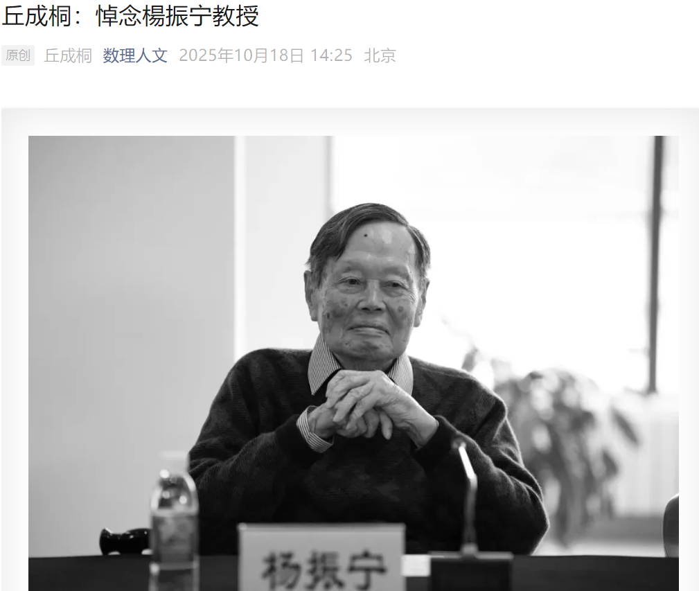 当天,国际著名数学家、清华大学数学科学中心主任丘成桐发文纪念:慕双雄携手,破宇称守恒,启我后学二三辈。继外尔规范,始强力物理,叱吒科坛六十年。