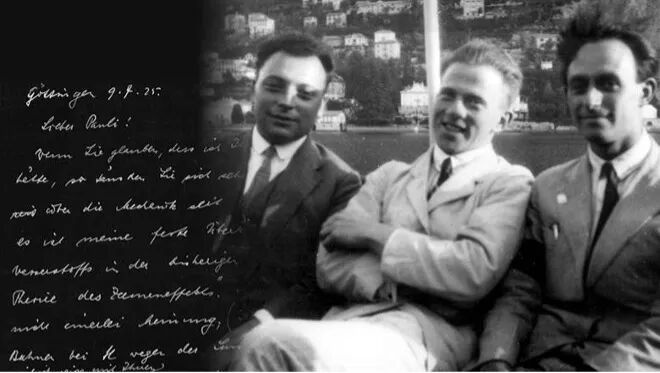 维尔纳·海森堡致沃尔夫冈·泡利的信(左);沃尔夫冈·泡利、维尔纳·海森堡和恩里科·费米(右)