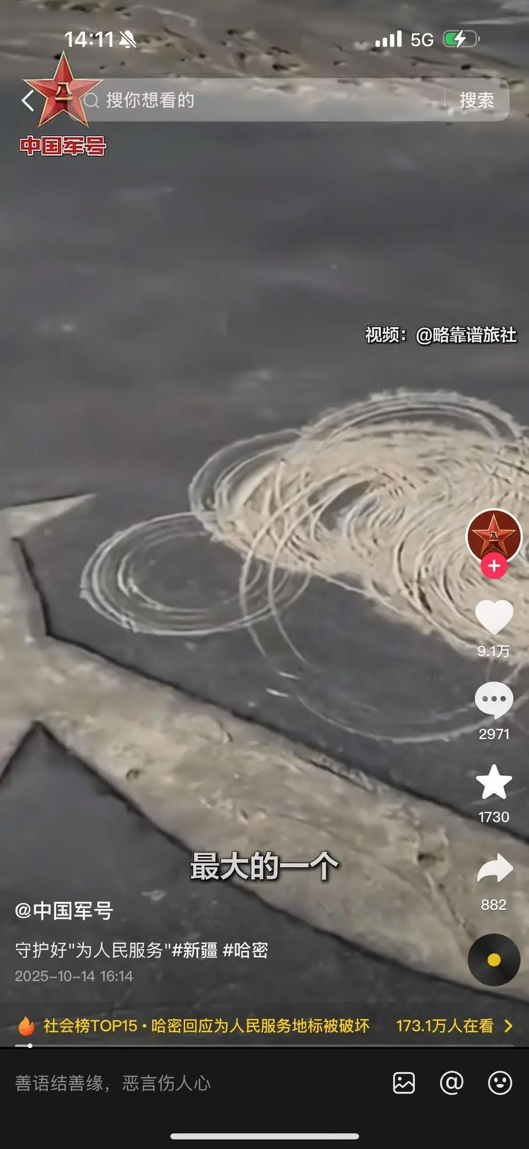 10月14日,微信公众号“吉林一号”刊文介绍,20世纪60年代,解放军第八航校在哈密建立,该校在哈密戈壁滩开展飞行训练时,为强化训练场地的辨识度,特意打造了包括“为人民服务”在内的地标大字。2024年,哈密戈壁滩“为人民服务”大字逐渐遭人开车漂移破坏。从网络视频中可以清晰看到,越野爱好者在标语上肆意漂移,留下了一个个刺眼的圆圈痕迹,有的地貌破坏极为严重,留下的沟壑深度可达一掌。