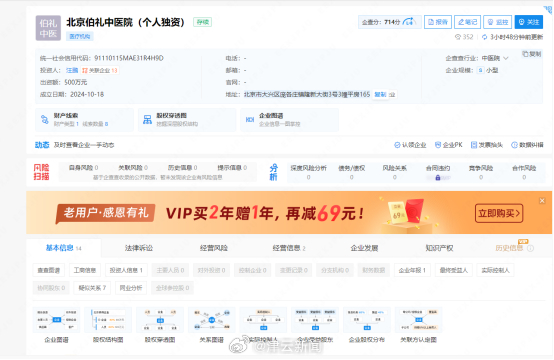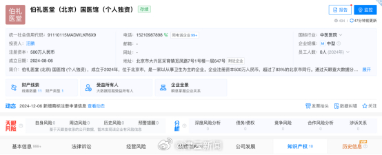 记者查询工商信息后发现,“伯礼医堂(北京)国医馆”、“北京伯礼中医院”均为个人独资企业,前者成立于2024年8月6日,后者成立于2024年10月18日,两家企业注册资本同为500万元,都是从事卫生为主的企业。