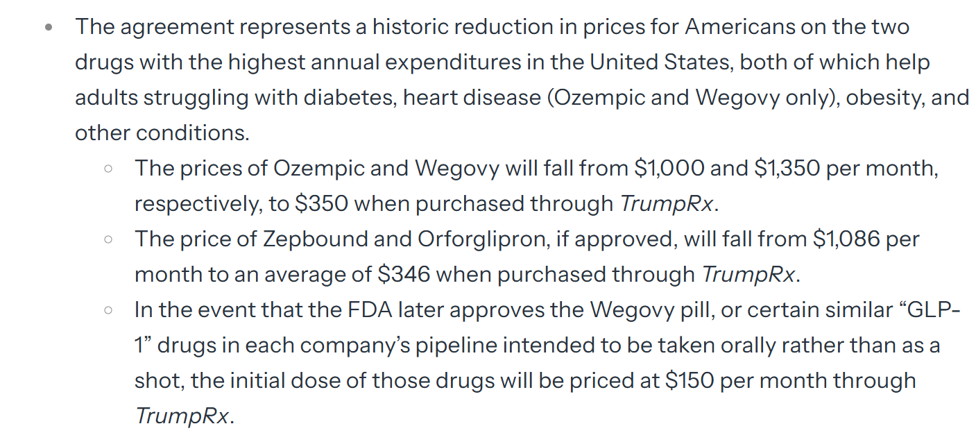 根据白宫公布的协议文本,在“川普大药房”渠道,诺和诺德的司美格鲁肽注射液价格将从每月1350美元降至平均350美元;礼来的替尔泊肽注射液和待监管审批的口服药(Orforglipron),将从每月1086美元降至平均346美元。若未来FDA批准口服版司美格鲁肽,或两家公司的其他口服药,定价将为每月150美元起。