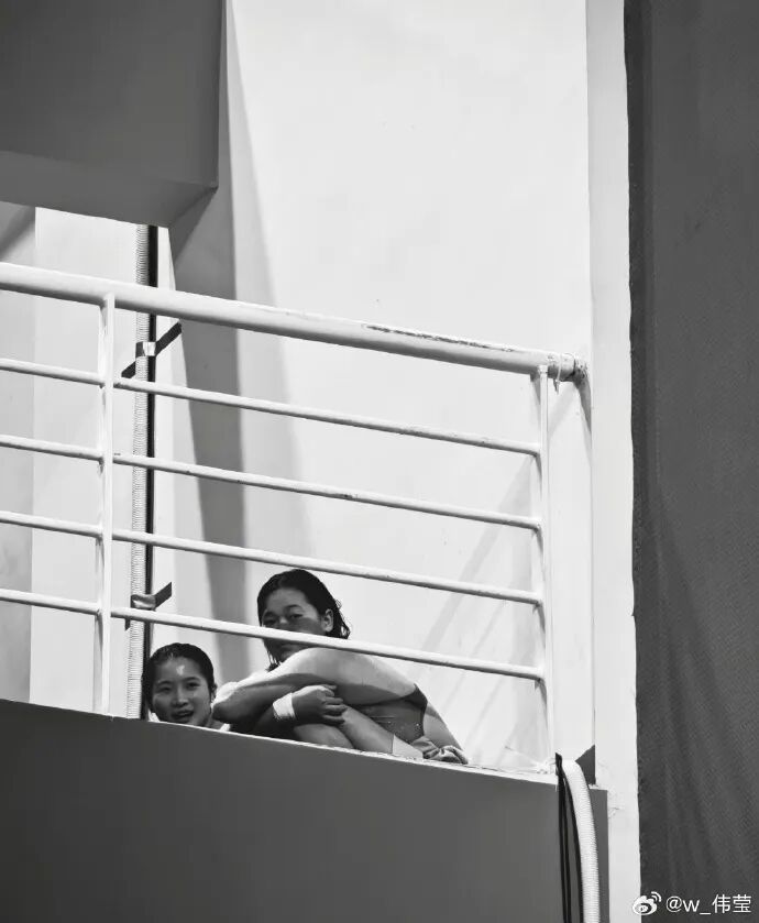 全运会前的练习间隙,小小的10米板过道上,穿着泳衣的少女们熙熙攘攘。