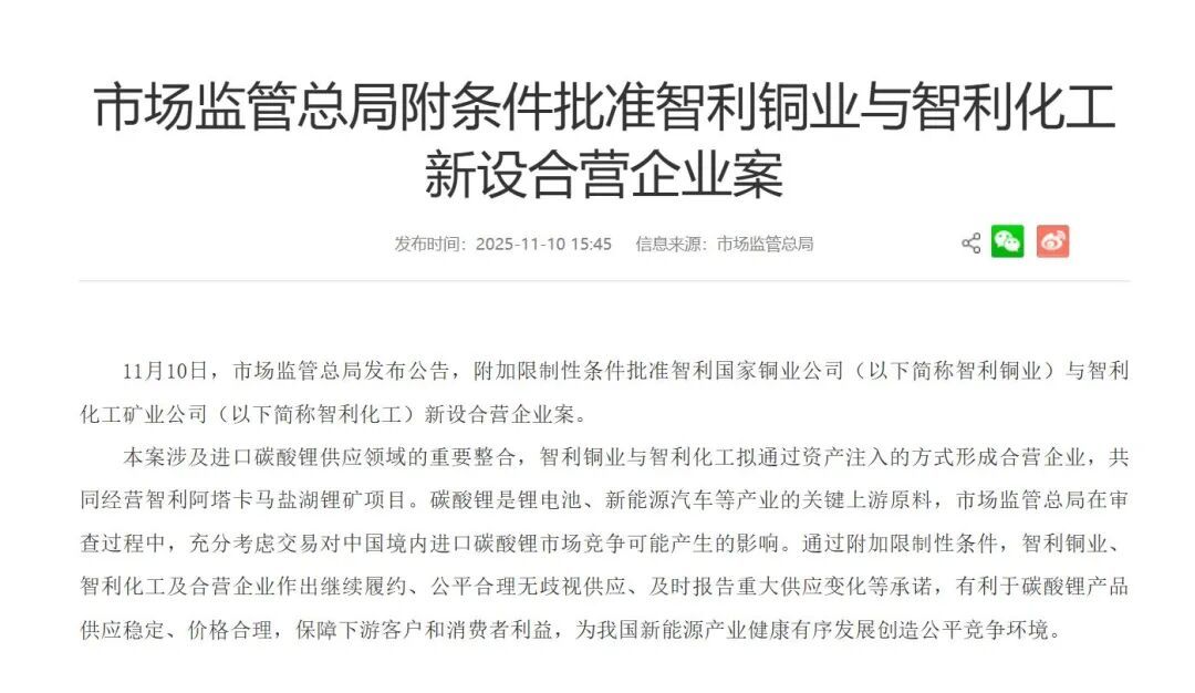 前不久,中国市场监管总局就上述“公私合营”一事进行附加限制性条件的批准。根据公告内容,碳酸锂是锂电池、新能源汽车等产业的关键上游原料,市场监管总局在审查过程中,充分考虑交易对中国境内进口碳酸锂市场竞争可能产生的影响。通过附加限制性条件,智利铜业、智利化工及合营企业作出继续履约、公平合理无歧视供应、及时报告重大供应变化等承诺,有利于碳酸锂产品供应稳定、价格合理,保障下游客户和消费者利益,为我国新能源产业健康有序发展创造公平竞争环境。