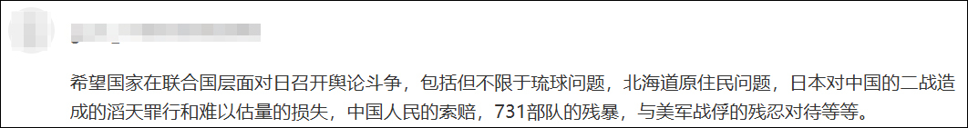还有网友指出:“希望国家在联合国层面对日展开舆论斗争,包括但不限于琉球问题、北海道原住民问题,日本对中国的二战造成的滔天罪行和难以估量的损失,中国人民的索赔、731部队的残暴,与美军战俘的残忍对待等等。”